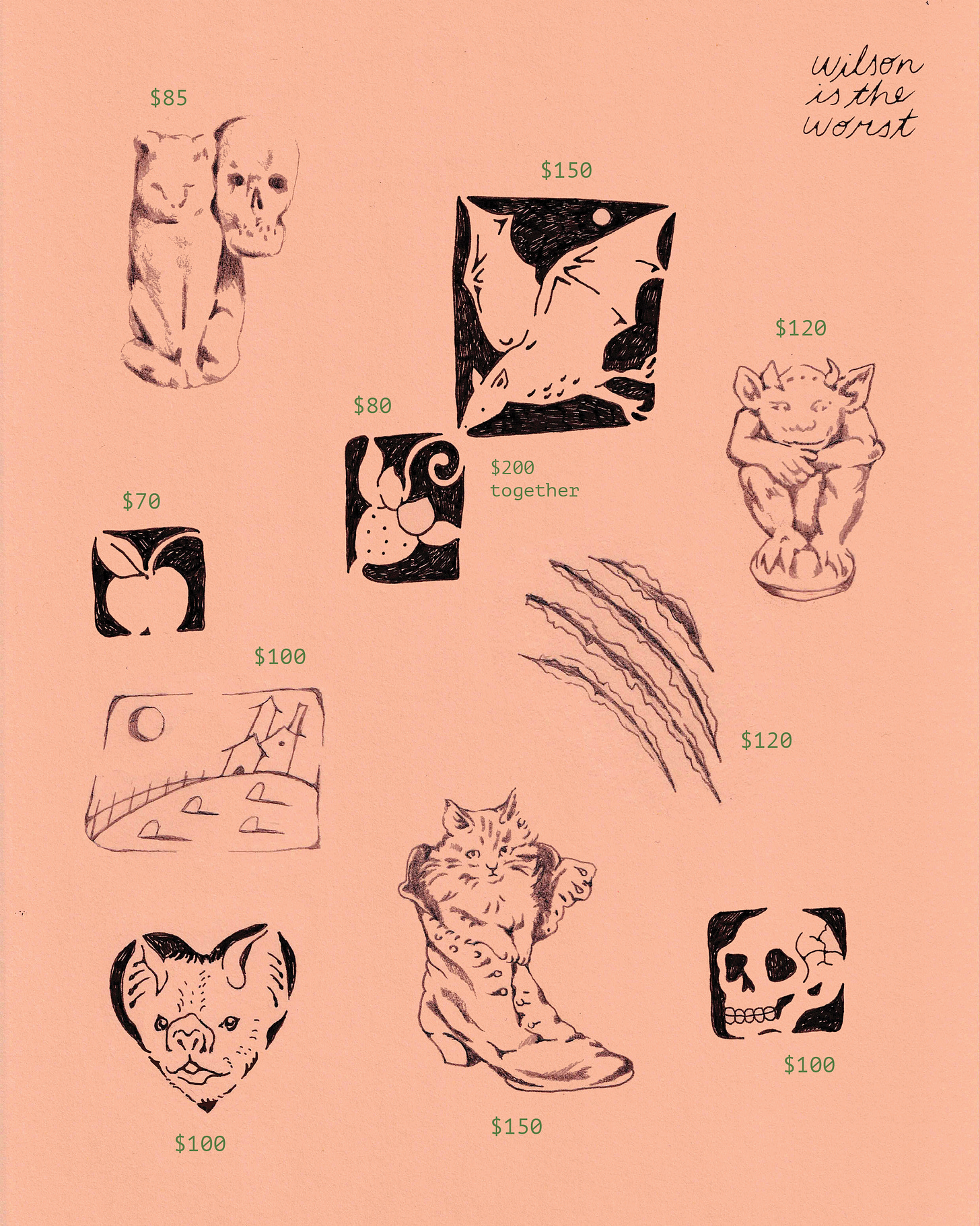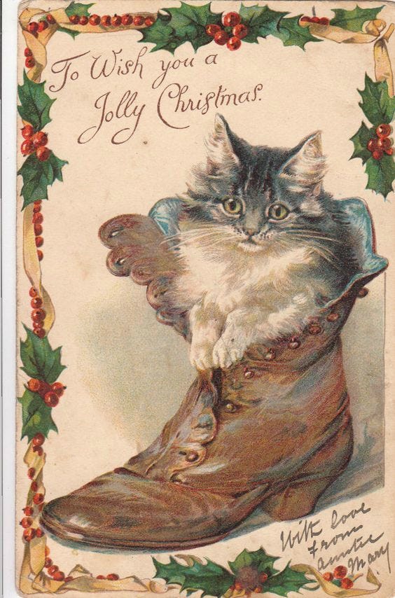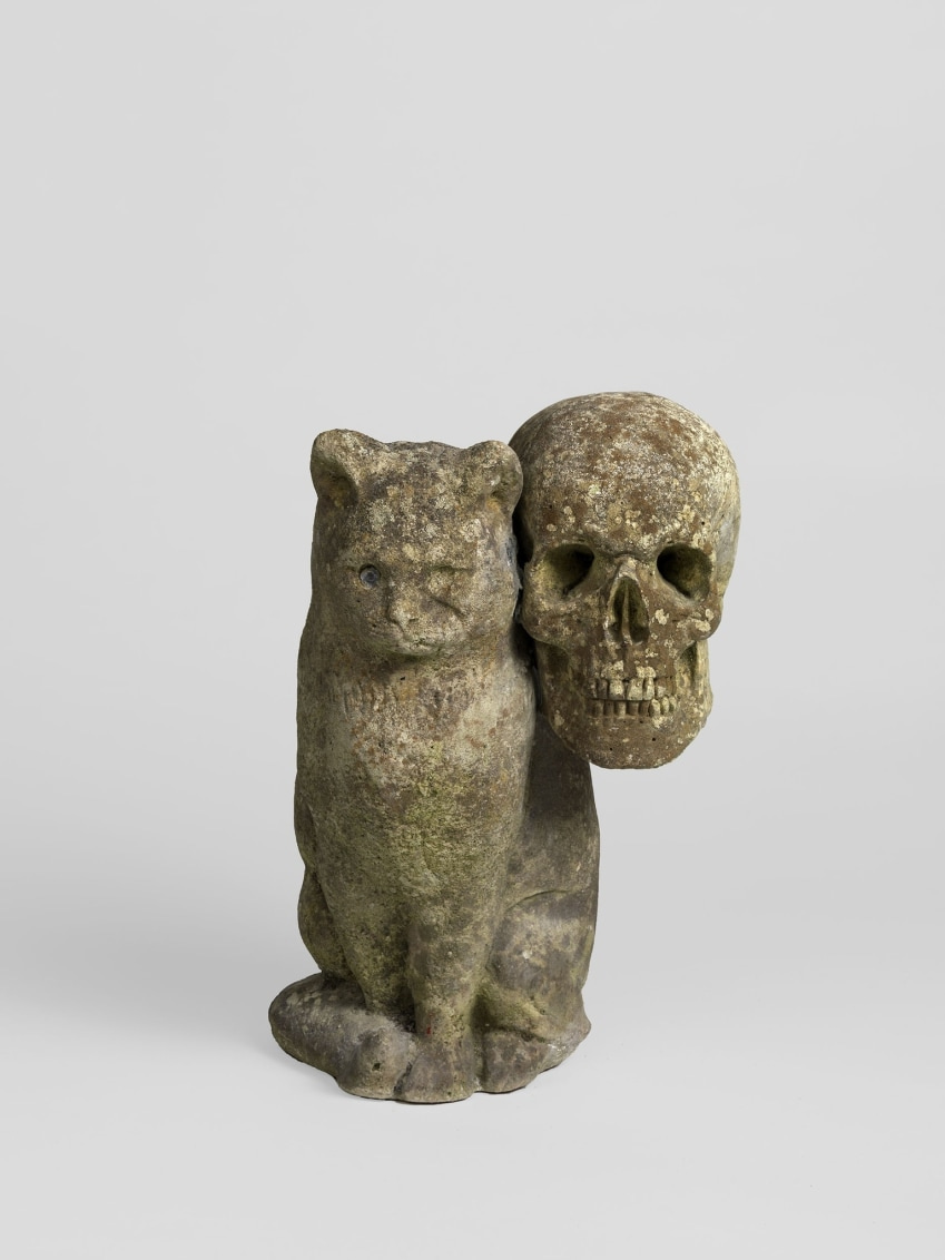The little cat in the boot is actually from a vintage Christmas card… but to me it felt so devastatingly witchy I just had to include it. And the little cat/skull stone drawing is based on a concrete sculpture by Jean-Luc Moulène.